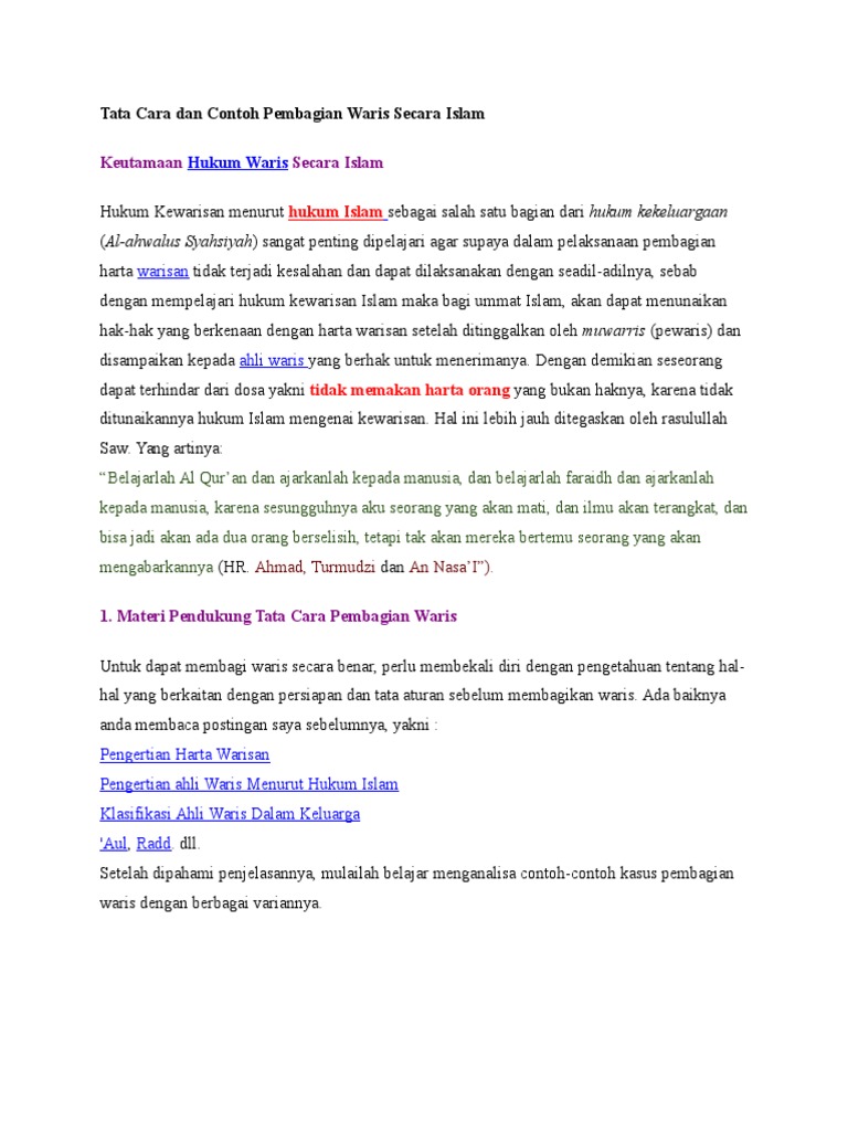 Tata Cara Dan Contoh Pembagian Waris Secara Islam