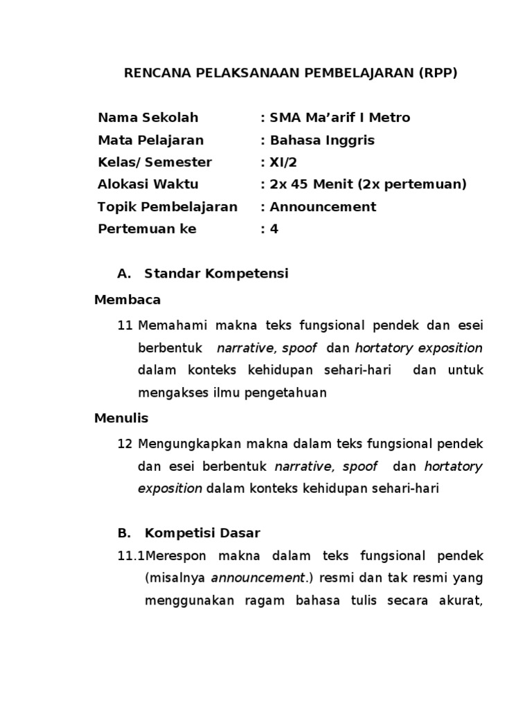 Rpp Bahasa Inggris K13 Kelas X Sma Tentang Announcement