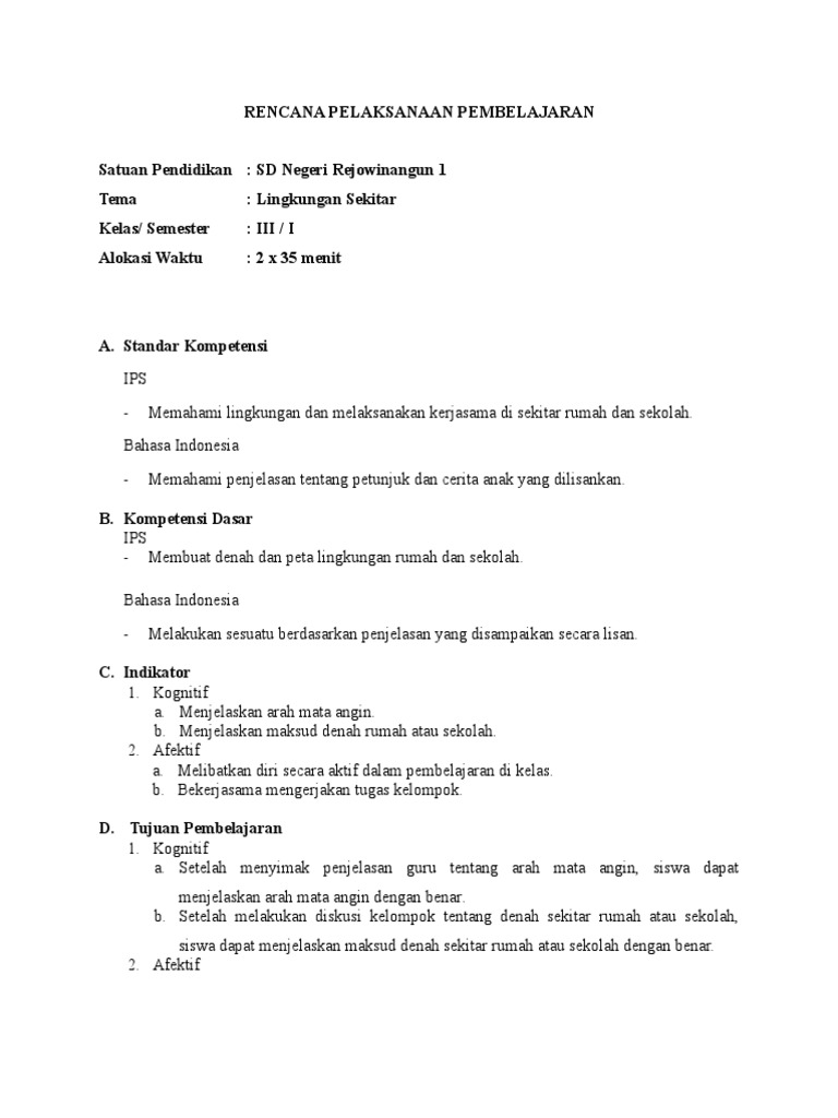 Rencana Pelaksanaan Pembelajaran Ips Kd 3 Denah Dan Lingkungan