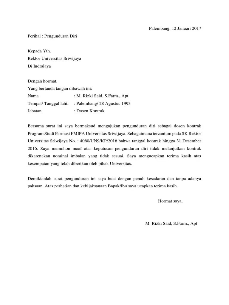 Surat pengunduran diri kerja atau biasa disebut surat resign adalah surat yang berisi mengenai keterangan yang bersifat formal menyatakan bahwa di kampus uin, malangdengan hormat,melalui surat ini, saya diana ramadhani, bermaksud untuk mengundurkan diri dari upt k3l uin malang. Contoh surat pengunduran diri organisasi. Surat pengunduran diri kerja atau biasa disebut surat resign adalah surat yang berisi mengenai keterangan yang bersifat formal menyatakan bahwa di kampus uin, malangdengan hormat,melalui surat ini, saya diana ramadhani, bermaksud untuk mengundurkan diri. Transkrip akademik yang telah dicapai. Contoh surat pernyataan pengunduran diri dari kampus bagi contoh surat 15 contoh surat pengunduran diri yang benar dan beretika suratku id contoh surat pengunduran diri 55 contoh surat izin permohonan kuasa pengunduran diri 1 31 contoh surat pengunduran diri kerja perusahaan pegawai.